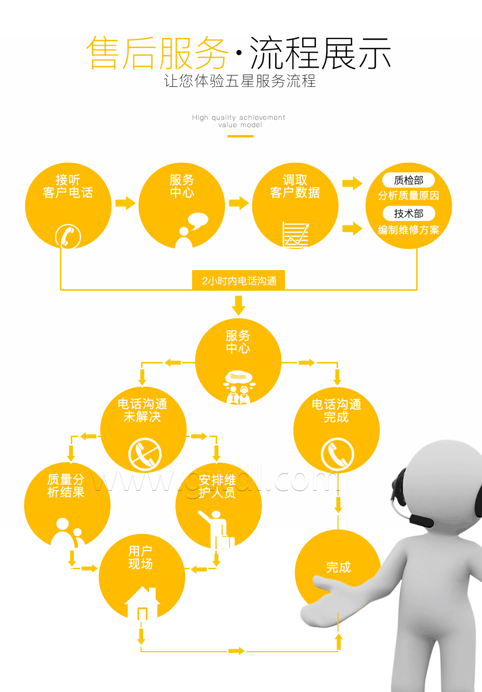 8、產(chǎn)品售后實行終身跟蹤服務(wù),隨時隨刻提供零部件及技術(shù)咨詢。采用定期專訪、座談、咨詢等形式來反饋用戶信息,并進行分析,研究實施改進措施,不斷提高顧客滿意度。