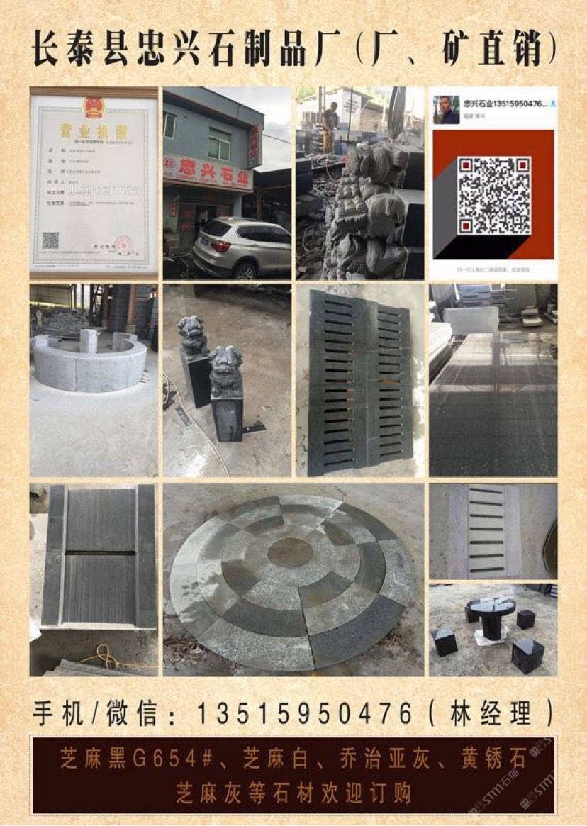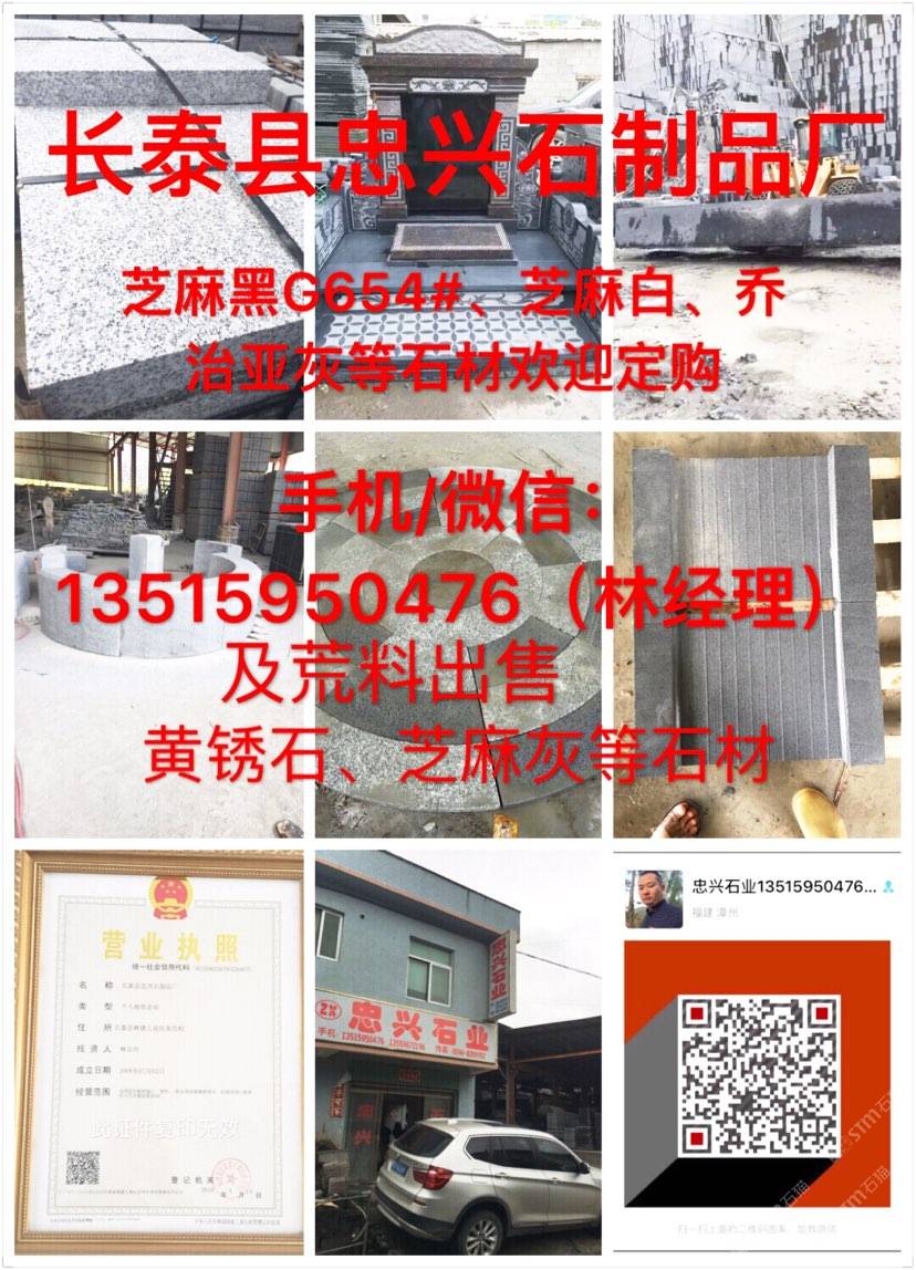 【長泰縣忠興石制品廠】礦區(qū)直銷、誠信經(jīng)營。(正常規(guī)格全部特價處理)專注:園林、市政工程.異形..別墅.荔枝面、火燒面、仿中國黑、墓碑石、荒料礦山直銷:G654芝麻黑 、G655芝麻灰 、黃銹石等。 我廠離廈門機場(50公里);距離高鐵廈門北站(40公里)導(dǎo)航地址:(長泰縣忠興石制品廠)地址:福建省長泰縣林墩美宮工業(yè)區(qū)。 電話/微信號:13515950476林經(jīng)理[握手] 歡迎到工廠考察、誠信服務(wù),合作互利,感恩有你!