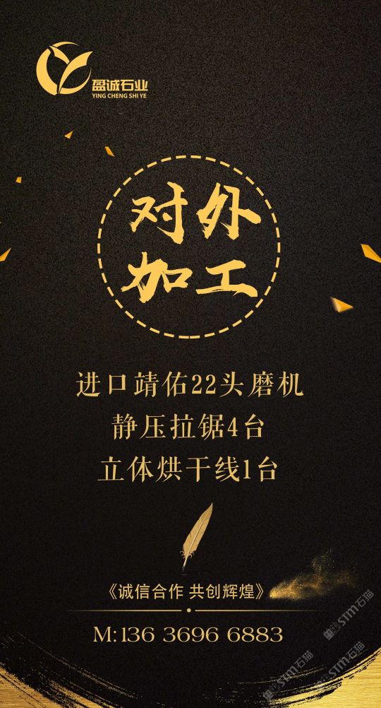 加工廠內(nèi)設(shè)進(jìn)口靖佑22頭磨機(jī),靜壓拉鋸4臺(tái),立體烘干線(xiàn)1臺(tái)。5臺(tái)快鋸、16頭自動(dòng)磨、3臺(tái)中切機(jī)、雙層補(bǔ)板線(xiàn)及烘干線(xiàn)、紅外線(xiàn)橋切、倒角磨邊機(jī)械、大型工程深加工,集設(shè)計(jì)、銷(xiāo)售,加工一體化流水式作業(yè)。承接外墻干掛、園林鋪地、異形加工、條板批發(fā)及出口訂單。本公司一直堅(jiān)持從礦山源頭把關(guān),為客戶(hù)爭(zhēng)取更大的品質(zhì)與優(yōu)勢(shì)