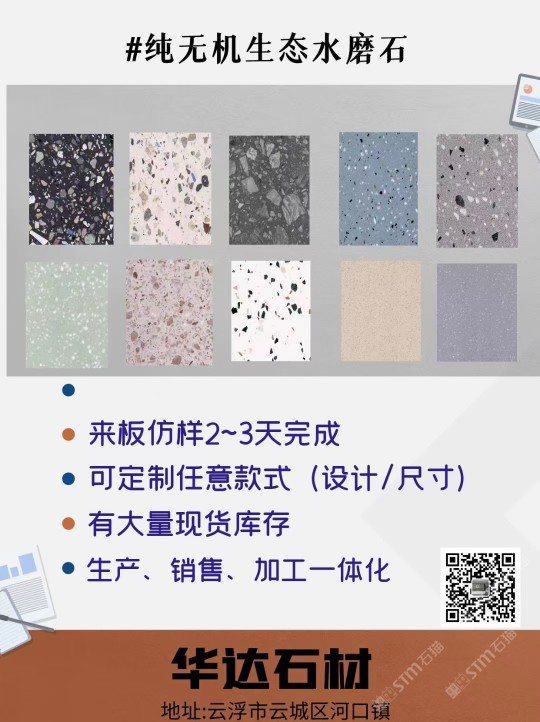 云浮市華達(dá)聚賢新型石材有限公司是一家以研發(fā)制造、加工、銷售新型人造石、天然石及其制品的企業(yè)。公司位于云浮市云安區(qū)石城鎮(zhèn)上洞村,占地面積30000平方米,年可生產(chǎn)人造無機(jī)石板材、自流平仿石材產(chǎn)品120萬平方。公司擁有原材料生產(chǎn)配套基地,保證日常生產(chǎn)所需的石料、石粉,有成品加工生產(chǎn)車間,有直營門店銷售,能為客戶提供從原材料選料、打樣定制、生產(chǎn)加工、工程配套等服務(wù)。華達(dá)聚賢新型石材無機(jī)水磨石、仿石材產(chǎn)品,屬于循環(huán)利用環(huán)保產(chǎn)品,所有原材料都是無機(jī)類選材,產(chǎn)品美觀實(shí)用,耐污耐磨,防火性能好,無異味,色彩斑斕,搭配元素多樣,深受國內(nèi)外設(shè)計(jì)師喜愛,適用于家具、商場(chǎng)、學(xué)校、酒店、地鐵站、政府機(jī)關(guān)、企業(yè)機(jī)構(gòu)等大型公共設(shè)施室內(nèi)外鑲貼,屬新型環(huán)保建材。公司通過GB/T19001-2016idtISO9001:2015質(zhì)量管理體系認(rèn)證和GB/T24001-2016idtISO14001:2015環(huán)境管理體系認(rèn)證。