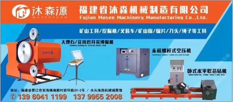 沐森機(jī)械 聯(lián)系人:尤    139****1199 查看 手機(jī)號碼:無 主營范圍: 礦山、石材外貿(mào)、石材工程資質(zhì)企業(yè)、石材機(jī)械、石材輔料及特殊工藝、 企業(yè)地址:福建泉州南安市水頭鎮(zhèn)中國石材機(jī)械輔料交易中心