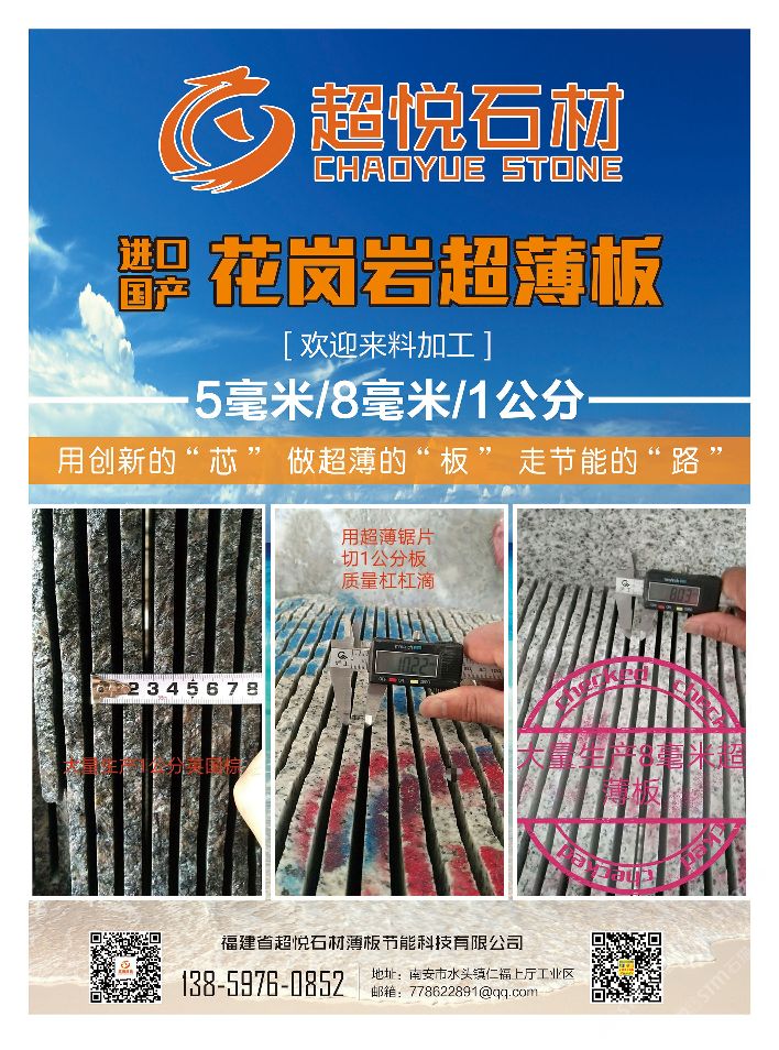 福建省超悅自在環(huán)保建材有限公司 聯(lián)系人:吳先生    138****0852 查看 138****0852 查看 主營范圍: 荒料、花崗巖加工、礦山、薄板復(fù)合板加工、 企業(yè)地址:福建南安南安市石井鎮(zhèn)濱海工業(yè)區(qū)支五路408號