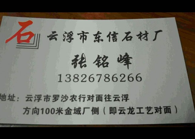 云浮東信石材 聯(lián)系人:張銘峰    138****6266 查看 手機號碼:無 主營范圍: 大板批發(fā)、 企業(yè)地址:廣東云浮羅沙農(nóng)行對面往云浮方向100米金域廠側(cè)