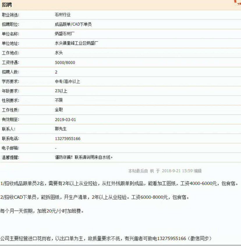 發(fā)布信息: 1/招收成品跟單員2名,需要有2年以上從業(yè)經(jīng)驗,從紅外線跟單到成品,能看加工圖紙,工資4000-6000元,包食宿。 2/招收CAD下單員,能拆CAD圖紙,開生產(chǎn)清單,2年以上從業(yè)經(jīng)驗。工資6000-8000元,包食宿。 每個月假期,工作8.5小時,加班20元/小時加班費。 公司主要經(jīng)營進(jìn)口花崗巖,以出口單為主,故質(zhì)量要求不低,有興趣者可致電13275955166(徽信同步)